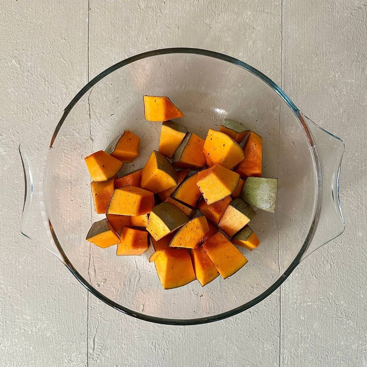 - Cut the crown prince pumpkin into small chunks and place them into a bowl.